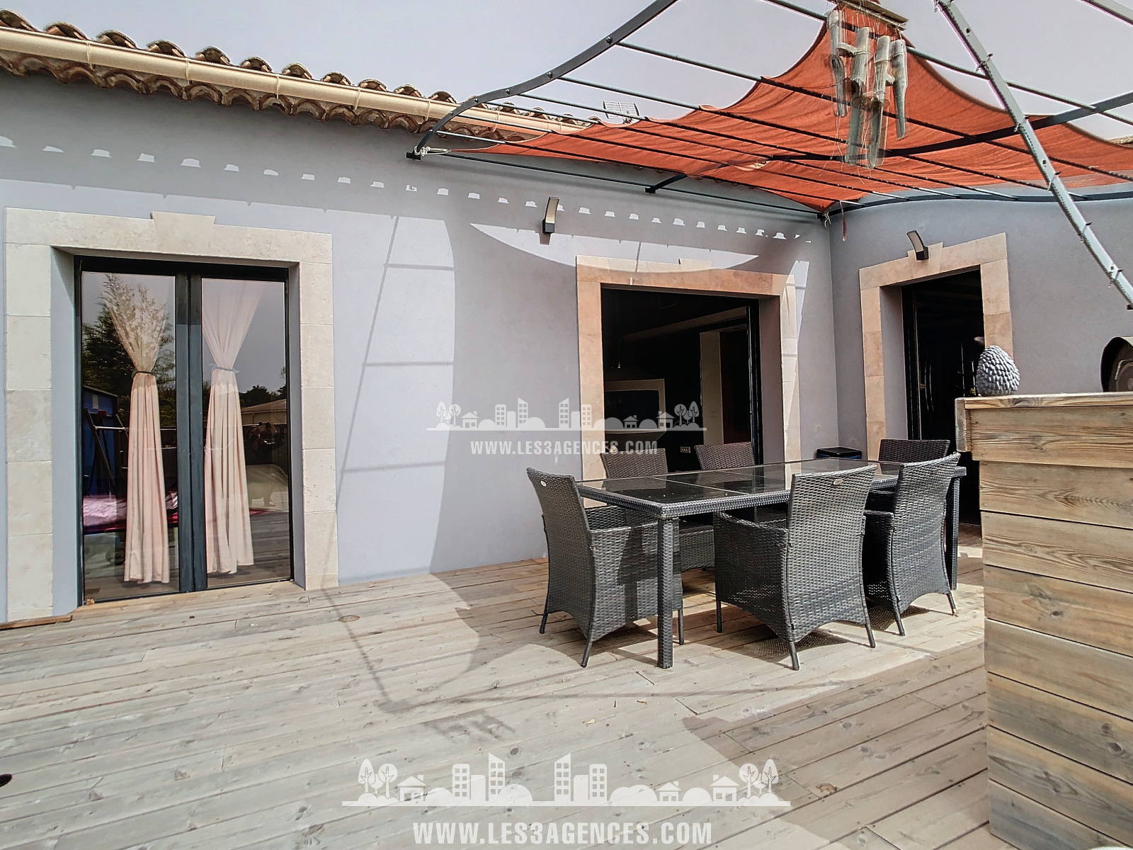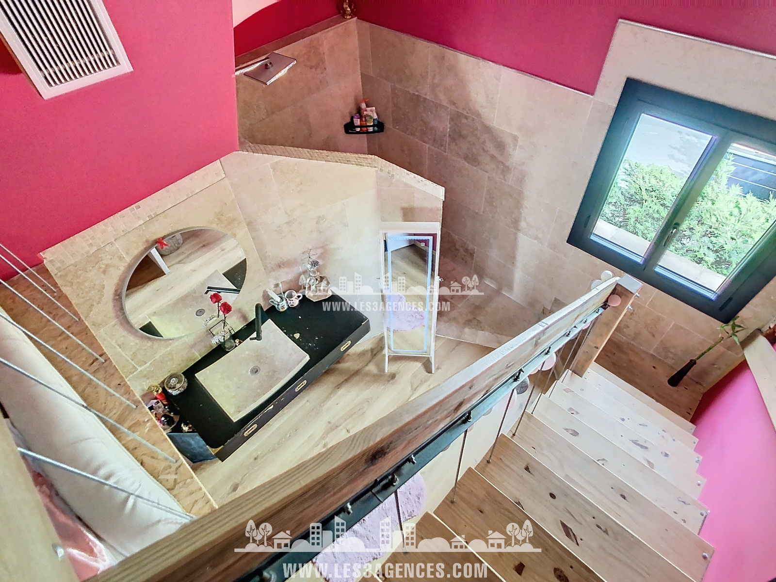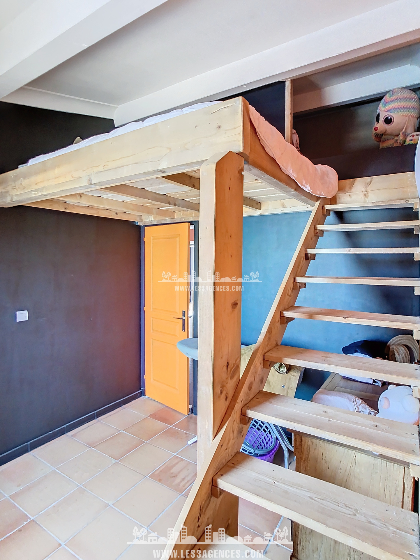 La maison de 96.70 m² est composée au 1er étage d'une grande pièce de vie, séjour et cuisine donnant sur une terrasse en bois de 50 m², 2 chambres avec mezzanine et 1 chambre avec salle de douche et WC indépendant.