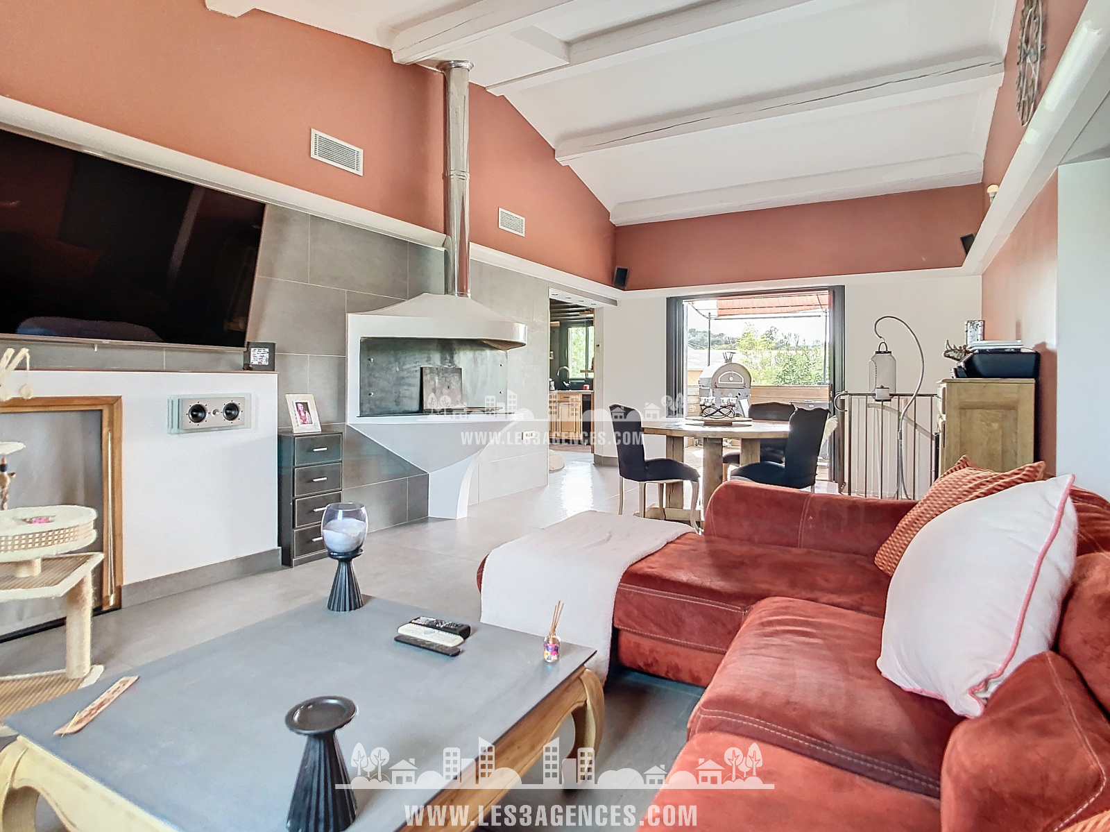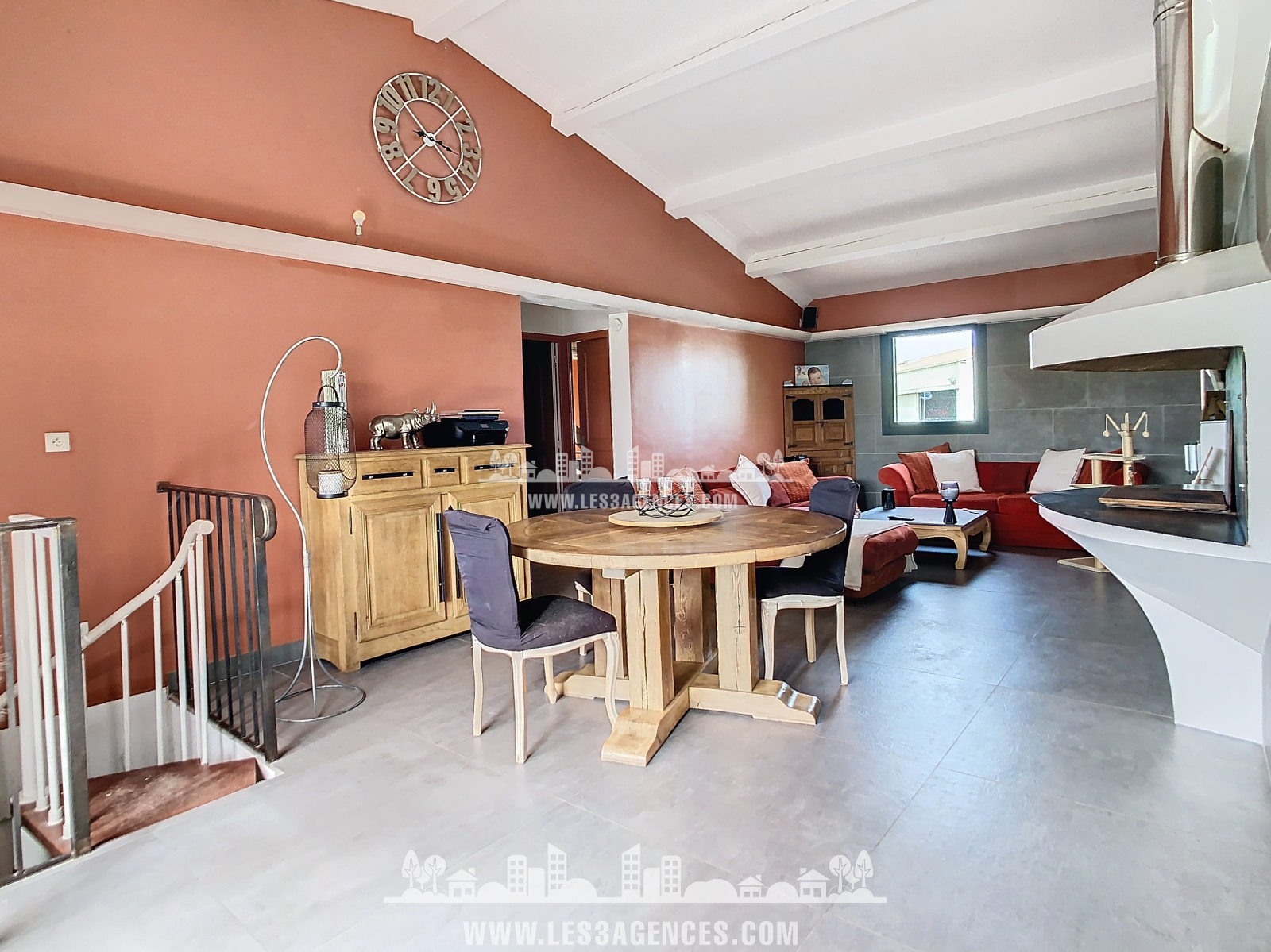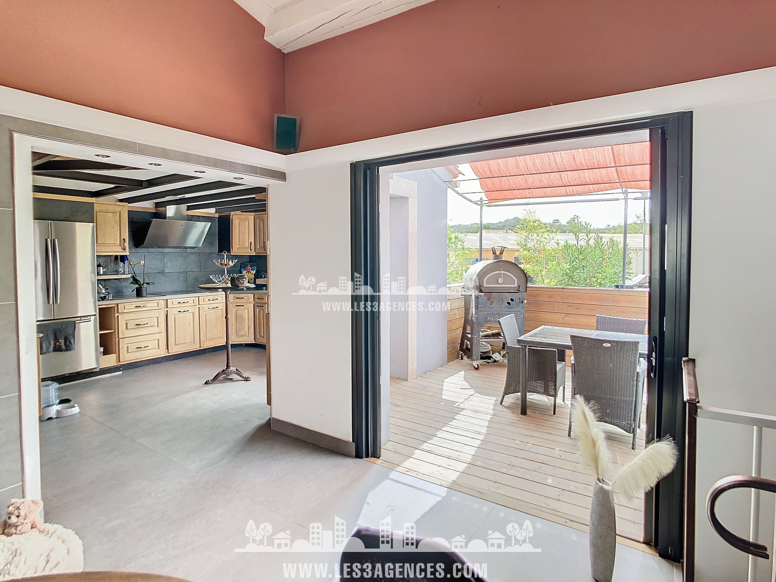 La maison de 96.70 m² est composée au 1er étage d'une grande pièce de vie, séjour et cuisine donnant sur une terrasse en bois de 50 m², 2 chambres avec mezzanine et 1 chambre avec salle de douche et WC indépendant.