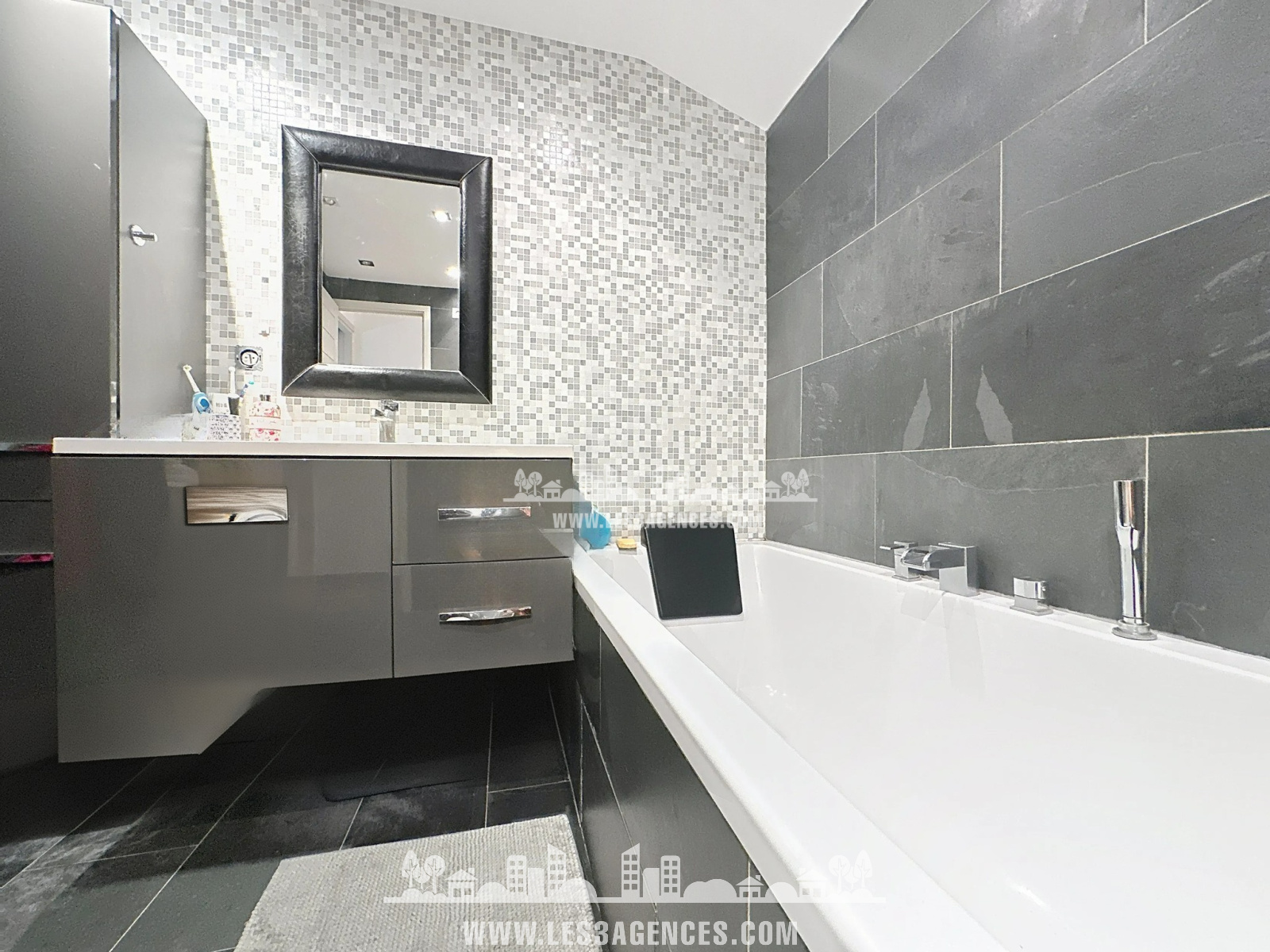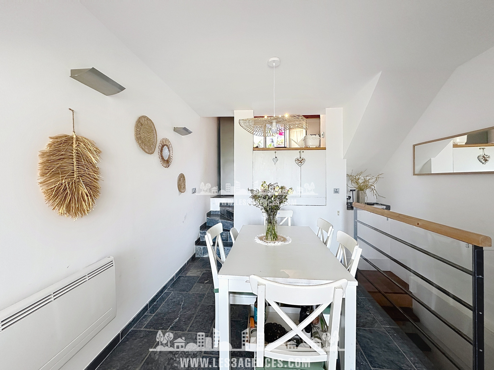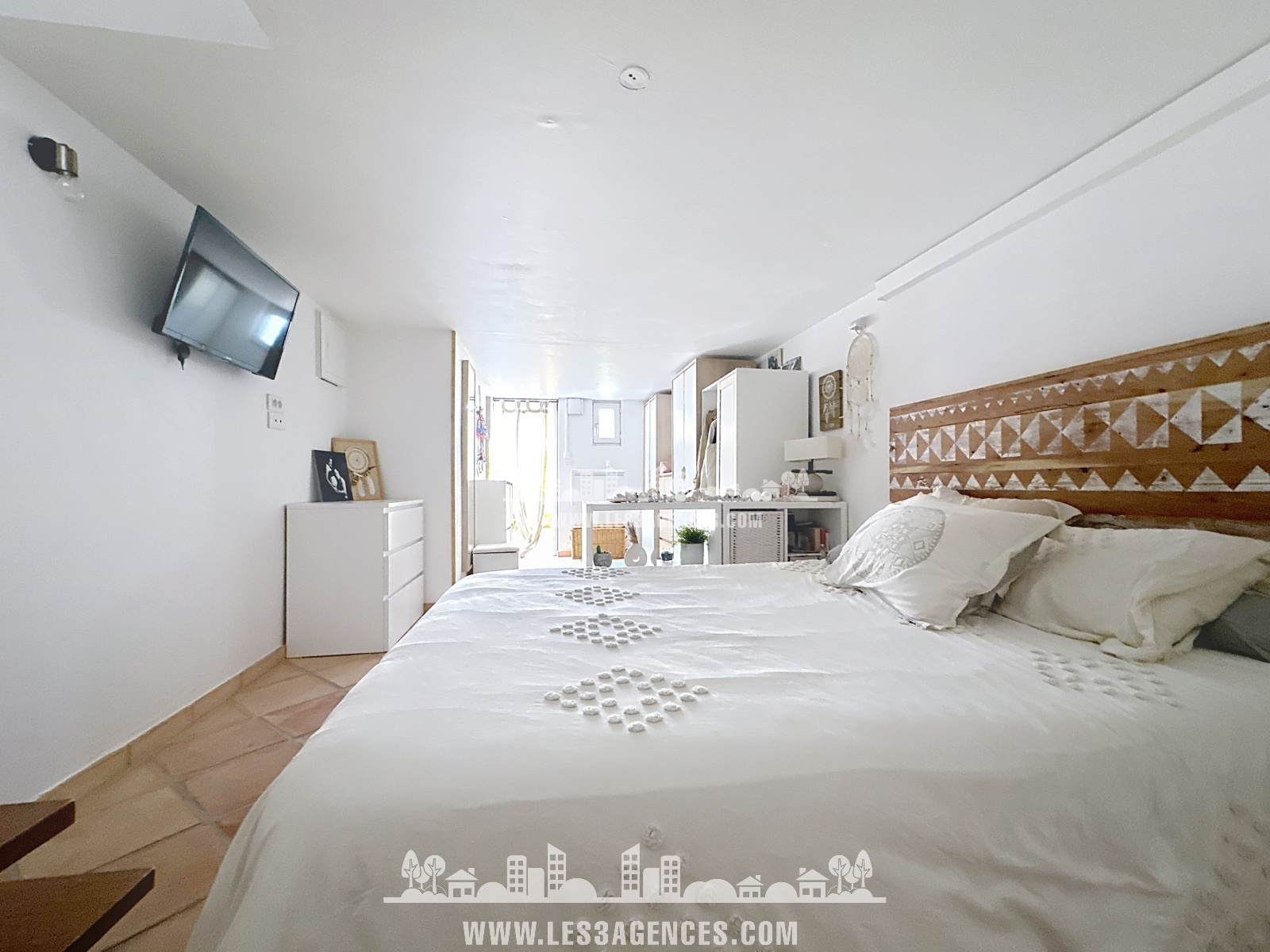 Au niveau supérieur, une chambre, une salle de bains, toilettes et espace rangement.