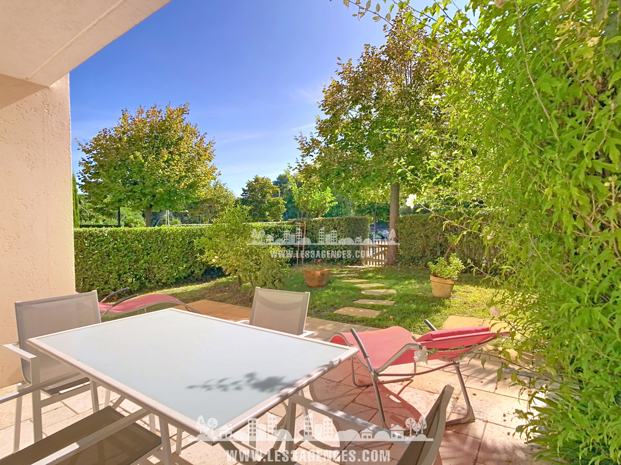 Son jardin privatif de 67 m² offre un véritable espace de détente pour profiter du climat méditerranéen, avec une vue sur bateaux.