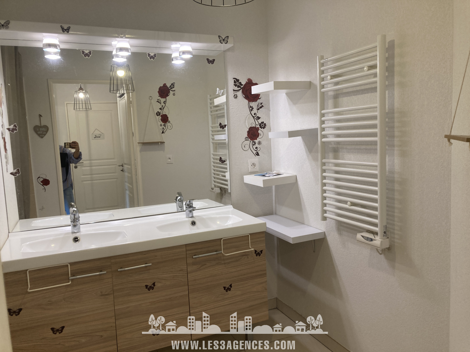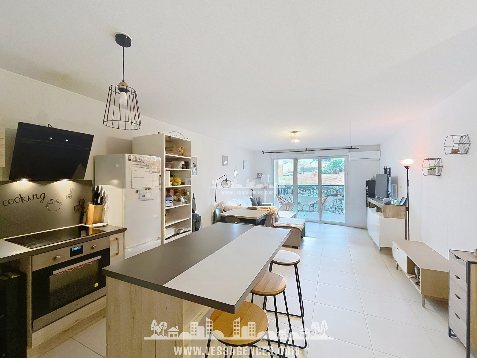 Cogolin (83310)Dans une résidence récente avec ascenseur, au 1er étage, T3 de 63.83 m² traversant avec loggia de 7.10 m² comprenant: entrée, piéce de vie avec cuisine ouverte, dégaement avec rangements, wc séparés avec coin buanderie, salle de bain, 2 chambres.