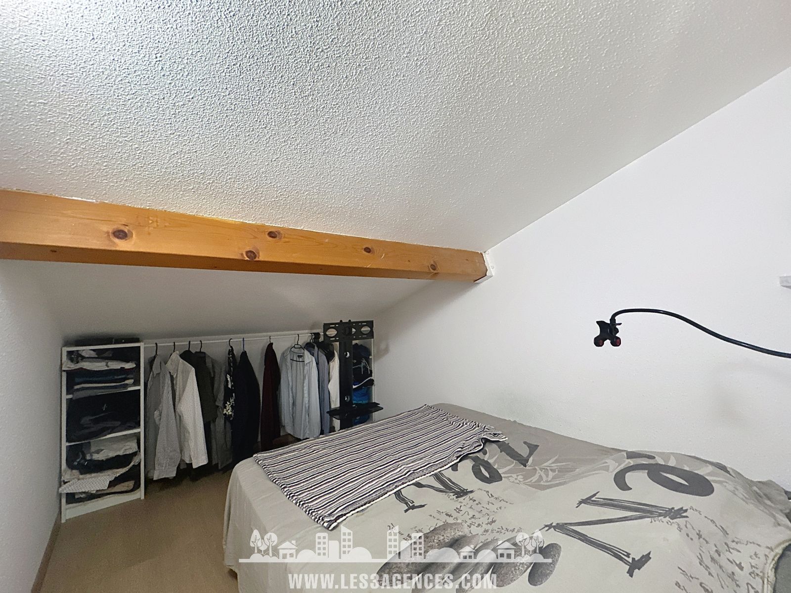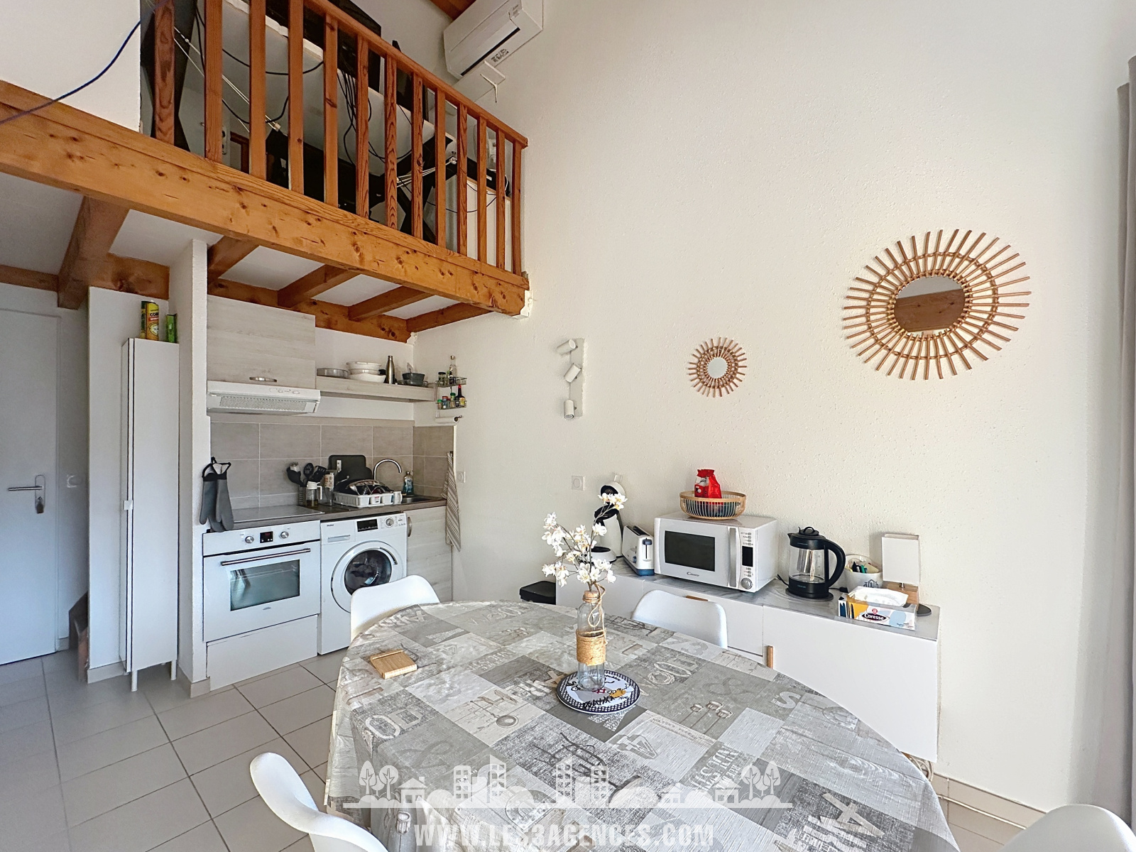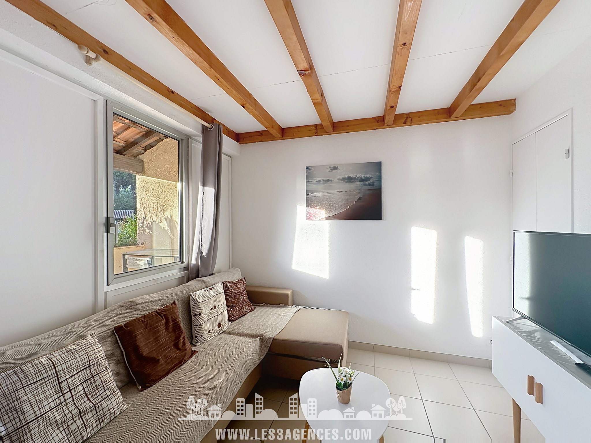 L'appartement se compose comme suit : une entrée, un wc indépendant, une salle d'eau, un séjour/cuisine ouvert sur une terrasse couverte de 6.5m².