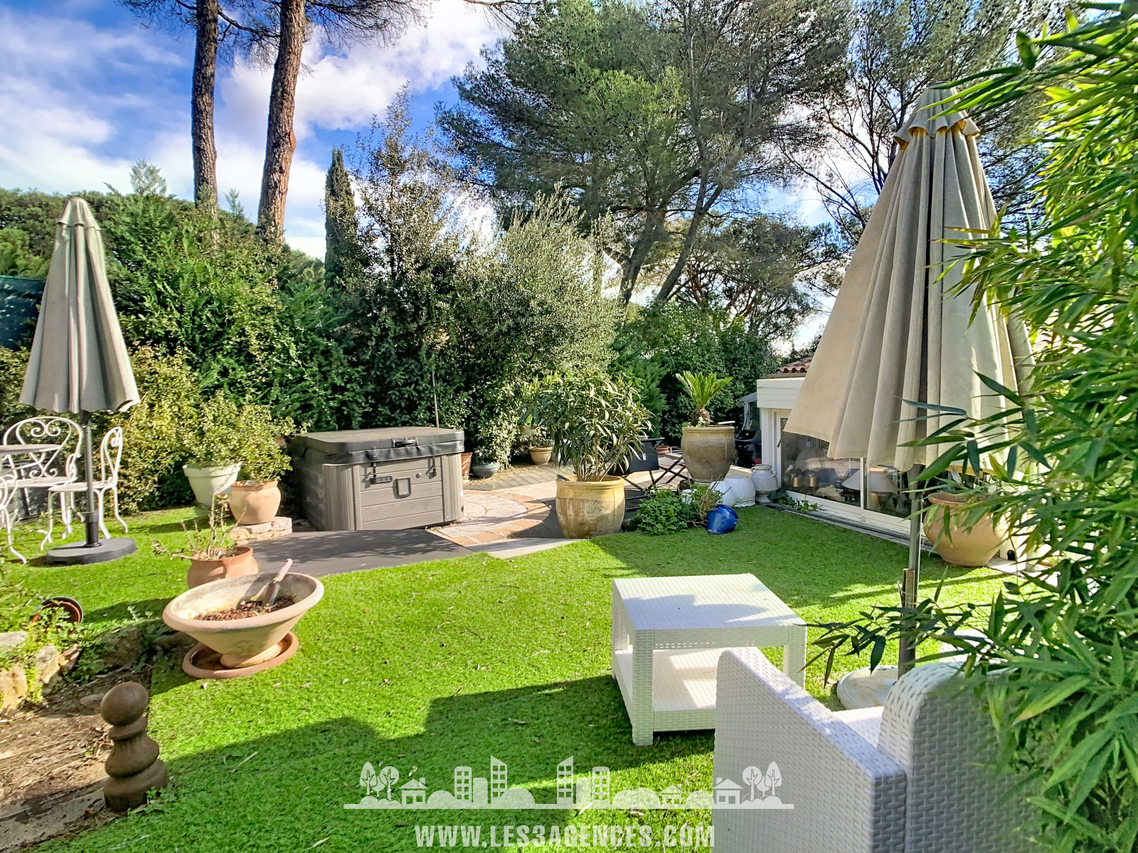 Gassin (83580)Au coeur du Golfe de Saint-tropez, dans un domaine sécurisé avec piscines et tennis, un lieu calme et boisé tout en étant à quelques minutes des plages et commerces, Double mas en parfait état comprenant 3 chambres dont une en rdc, une belle pièce à vivre, cuisine aménagée équipée, 2 salle d'eau, 2 wc , cuisine d'été . Le jardin est arboré, fleuri et sans vis à vis. Un jacuzzi 6 places permet de se détendre en toute intimité et un grand cabanon est installé dans le jardin.